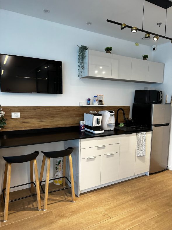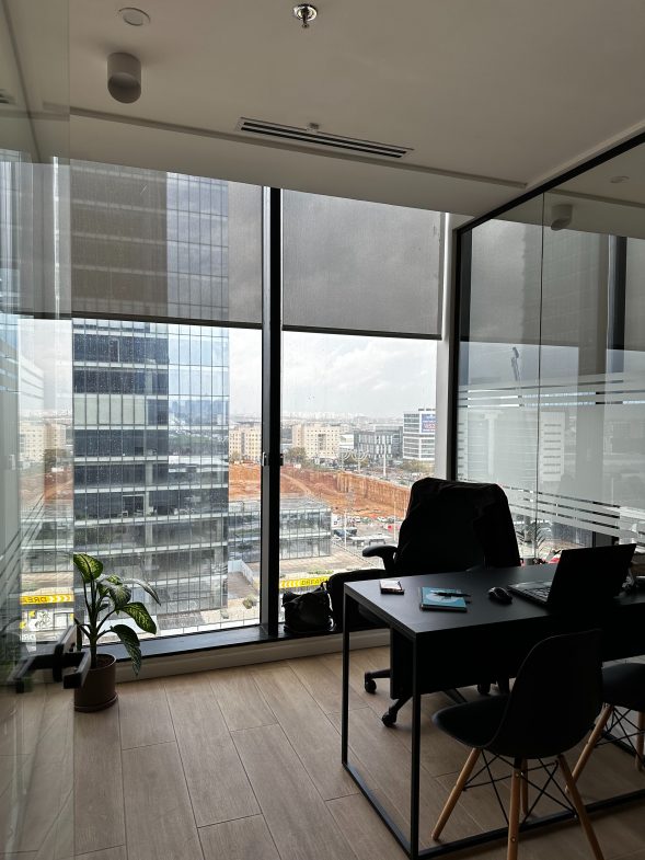 בתוך משרד יוקרתי וחדש במתחם בסר סיטי פתח תקווה מוצע להשכרה חדר עבודה בגמר מלא ועמדת ישיבה בכניסה למשרד.